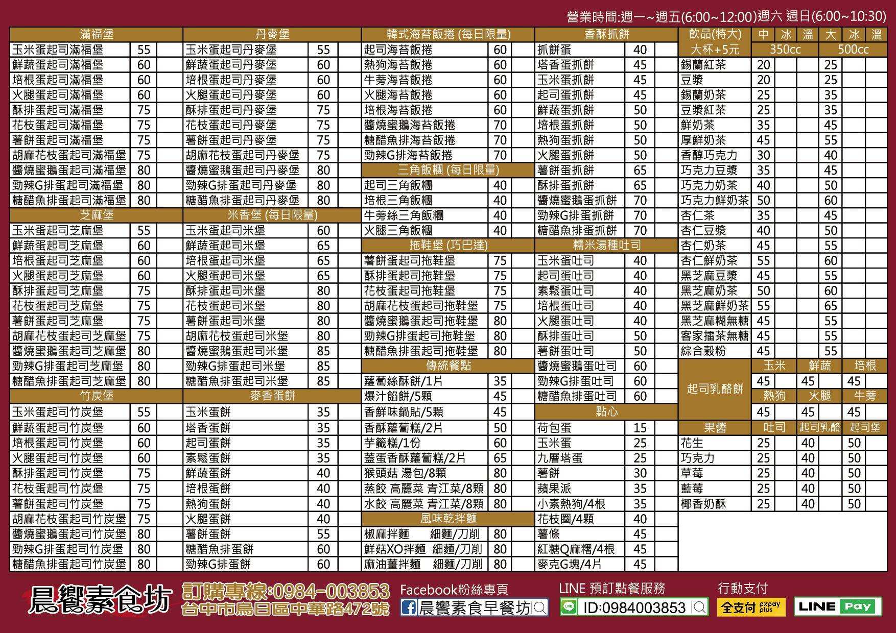 菜單取自臉書,看上去餐點十分多樣化,有各式堡/飲品/吐司/蛋餅/點心等,各種傳統餐點與特色餐點也可打電話跟Line預訂。