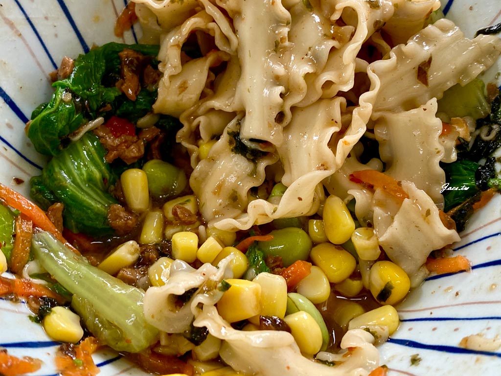 鮮菇Xo刀削麵,麵條較厚口感帶有勁道,XO 醬混著各種繽紛食材一同拌在寬大的麵體表面,讓每一口都很有存在感。