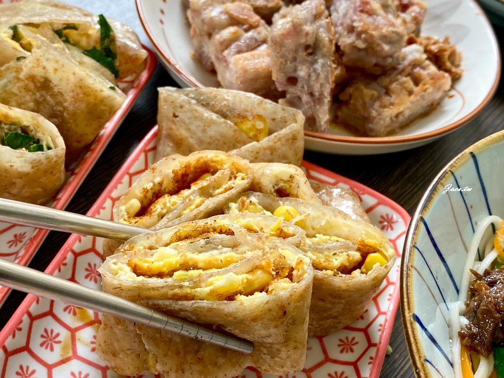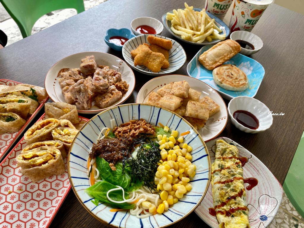 豆漿紅茶(溫)/麥克G塊/豆漿(冰)/玉米蛋餅/塔香蛋餅/蘿蔔絲酥餅/芋籤糕/蘿蔔糕/九層塔蛋/麻油薑拌麵(細麵)/九層塔蛋/蘋果派/薯條