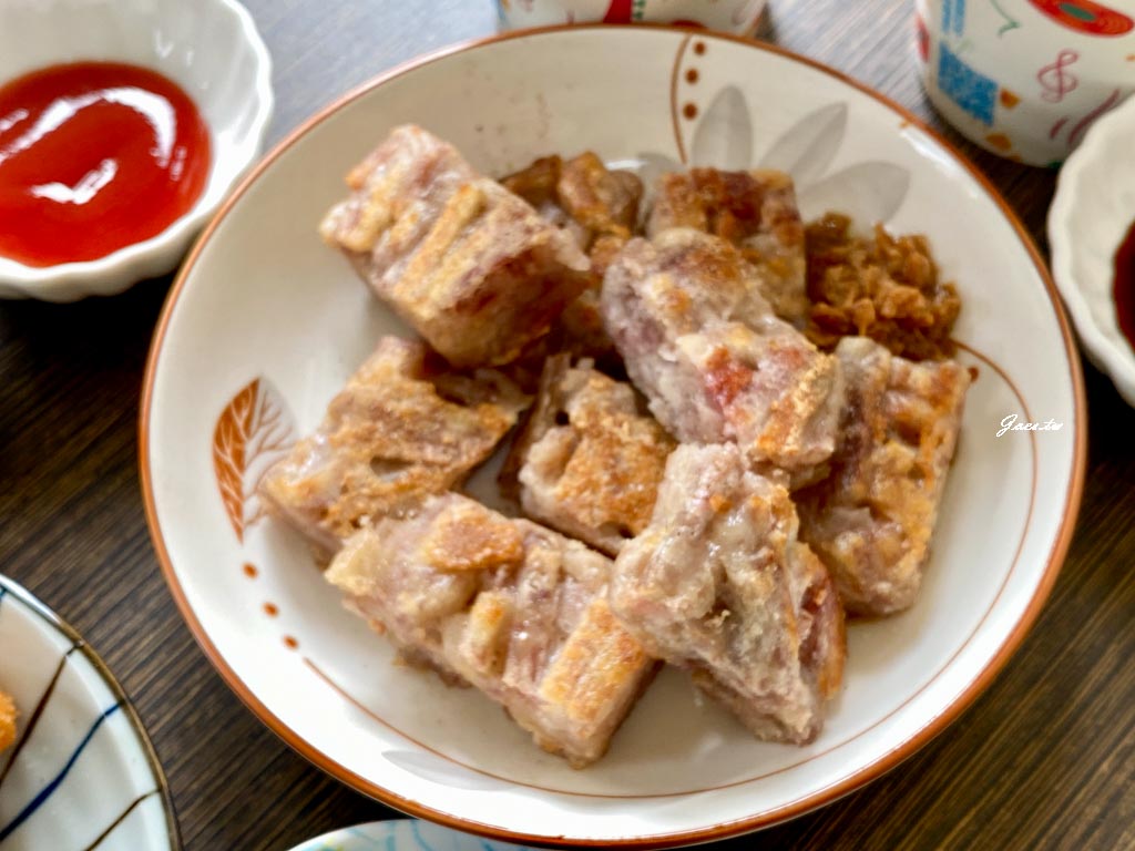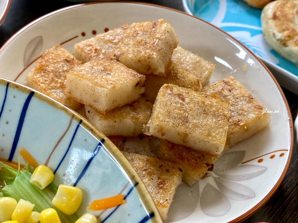 蘿蔔糕外皮恰恰內餡偏軟吃得到一絲一絲的口感調味裡吃得到些許帶點海鮮味的素料,問店家才知是猴頭菇。