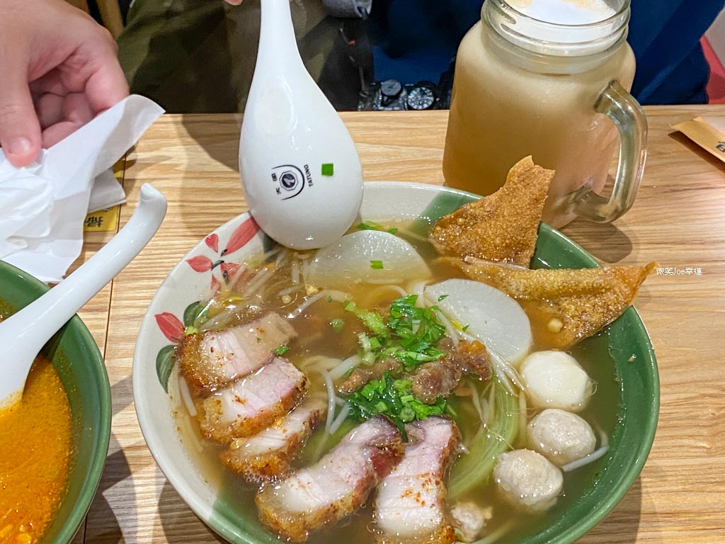 配料挺豐富,一旁的炸餛飩皮要趁一上桌就品嚐可以感受到脆口酥香,雖然主菜是脆皮燒肉,但湯頭喝來意外清爽,沒什麼油膩度,鹹度略有存在感,底韻透著清甜。