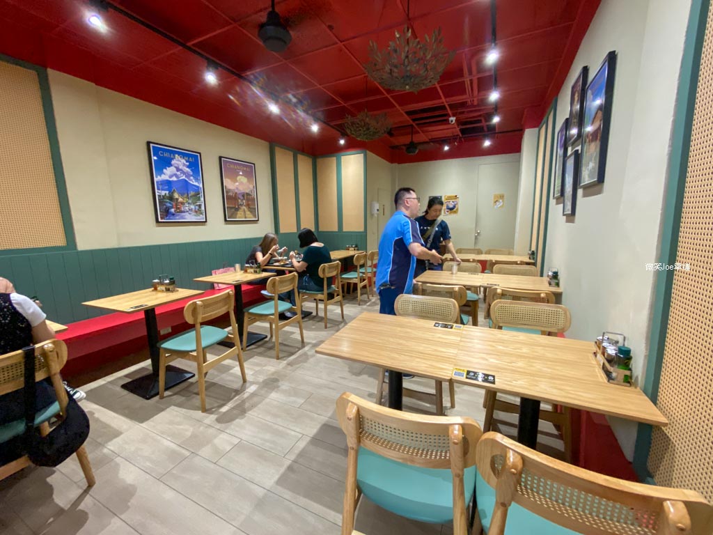 店內主要以木質桌椅為主,看上去十分簡潔,向上望去,紅色天花板與店內的綠色形成對比,牆面間還掛有多幅風景照與特色甜點照為整家店的氛圍增添一抹活潑,讓人有種置身異國小館氛圍。