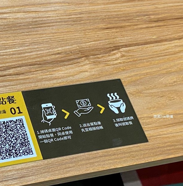 座位上有貼點餐方式,掃Qrcode點餐後要先到櫃台付款,店家會給我們取餐鈴,採半自助式供餐,取餐和回收餐具都由我們執行哦,有點像是去到美食街用餐的感覺。