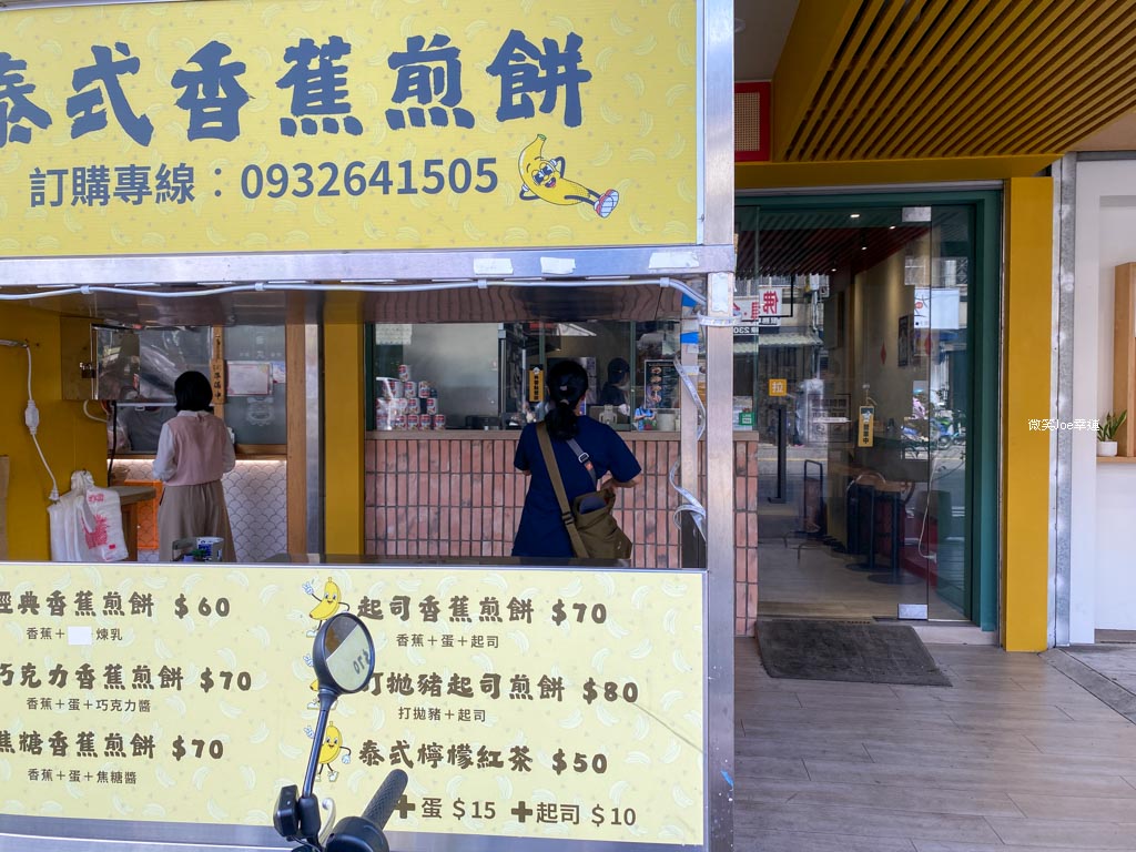 騎樓間有家香蕉煎餅攤位,平日要四點開始營業,假日則是中午就有。