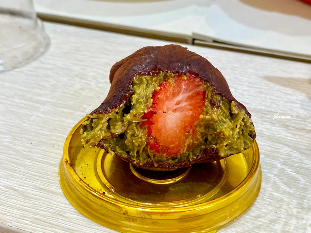 咬開後裡面有包裹整粒的酸甜草莓,一旁有帶著開心果氣息吃來脆口的碎片最外層的餅很Q,多種衝突的口感,個人是第一次吃到這類的食品,其中草莓跟巧克力太搶C位,開心果的氣息就式微些難分誰是主軸,不覺得難吃,只是有點吃不懂。