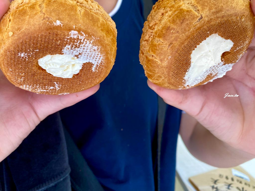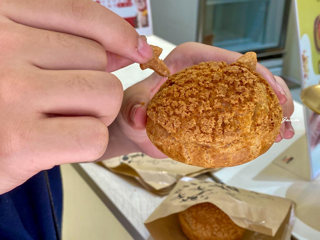 外皮現場吃真的蠻酥,酥皮還帶著淡淡香氣有點類似餅乾的薄脆感咬下時能感受到外皮輕輕鬆開碎裂。