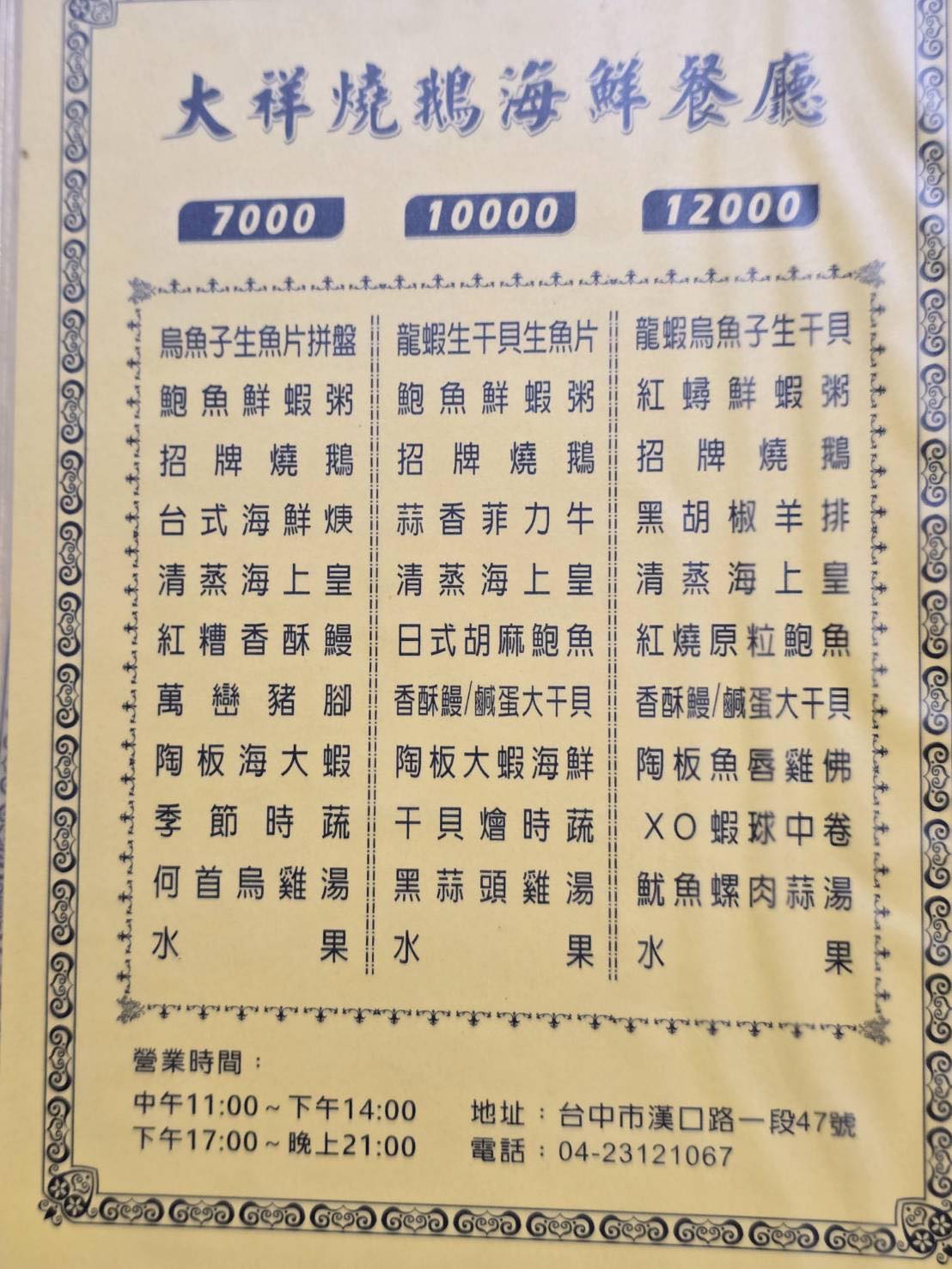 大祥海鮮燒鵝餐廳位於漢口路一段47號,靠近台灣大道交叉口,鄰近漢口國中(斜對面)。餐廳門前有機車停車格,開車可停附近收費停車場,步行也方便,大祥海鮮燒鵝的外觀不是走華麗風格,但招牌蠻顯眼的,平時路過就能輕易發現。