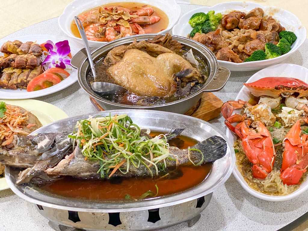 蒜香蒸大沙公/清蒸龍虎斑/櫻花蝦米糕/干貝燴虎掌/麻油海大蝦/香酥芋泥鴨/黑蒜頭燉全雞。