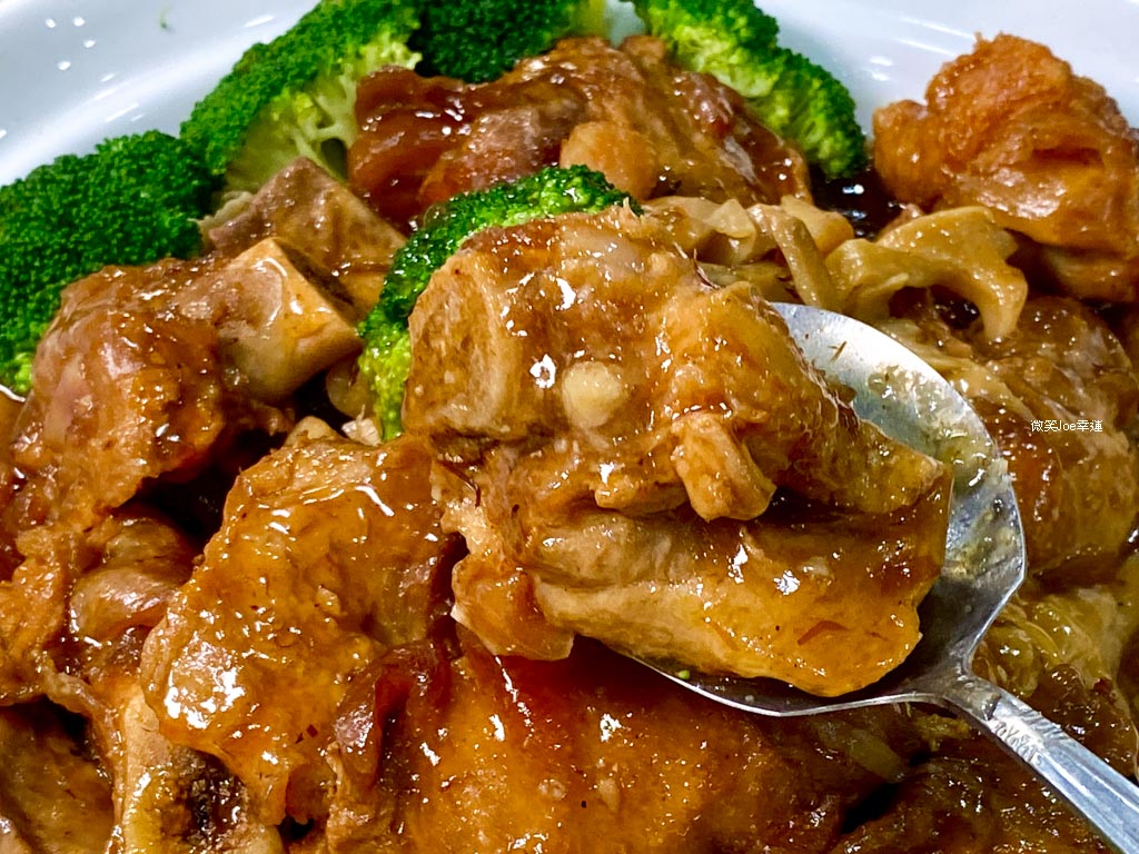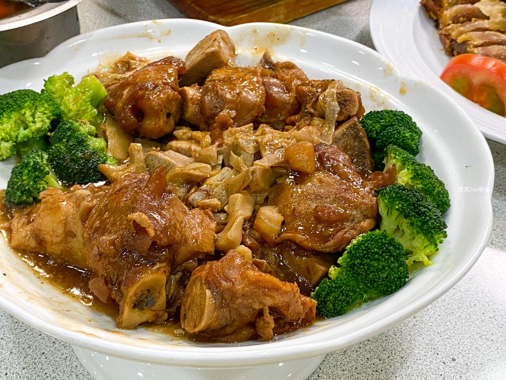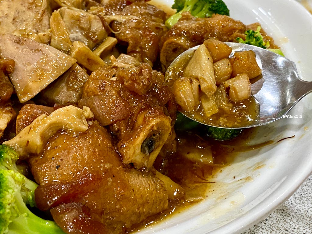 餐點裡有小干貝/芋頭/虎掌(豬蹄筋),虎掌與芋頭都有先炸過,再以紅燒的方法烹調,外皮Q彈、內部柔嫩,帶些筋感。