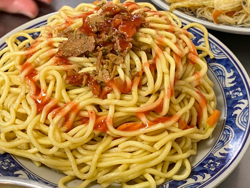 炒麵(小),麵上淋有素燥,比起炒麵香,更讓我們覺得驚人的是小碗這份量是否有點扯,朋友們笑著說,還好我們是點小的,要是點了大的沒有食力肯定會飽翻,配料裡有少量菜搭配,口感有Q不軟爛吃來香氣滿滿,與朋友們一同分食時還邊說好吃耶XD,