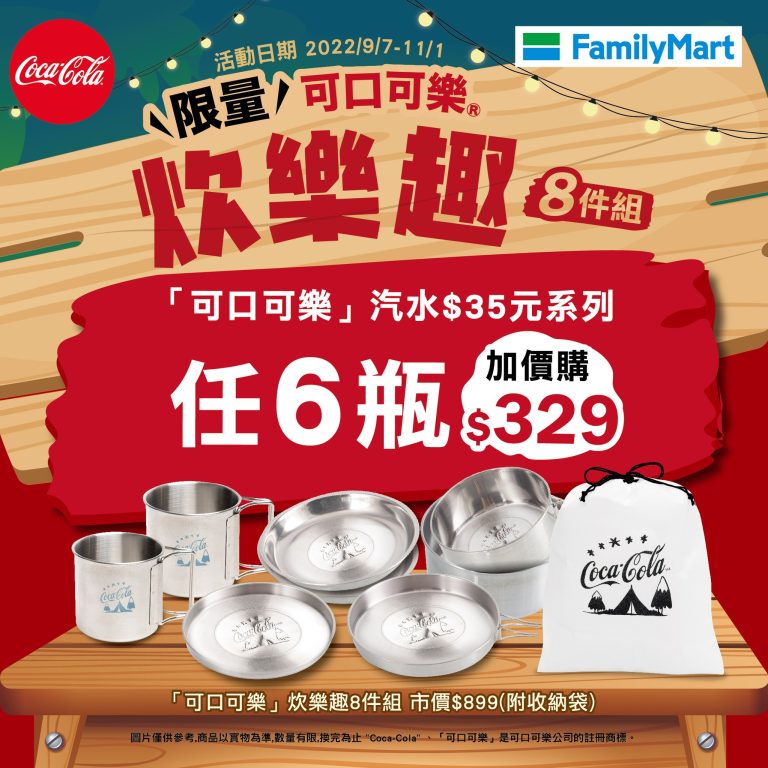全家聯名可口可樂,推出可口可樂炊樂趣加購樂活動~不鏽鋼露營餐具八件組好收納。