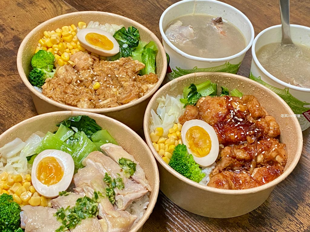 丼飯都是使用圓形紙深碗盛裝,擺上主餐後整個份量看起來很扎實,每碗都有剛配置青菜、對切的溏心蛋,配菜都是用炒的調味較淡,飯則是使用長米,吃來粒粒分明。完整食記介紹