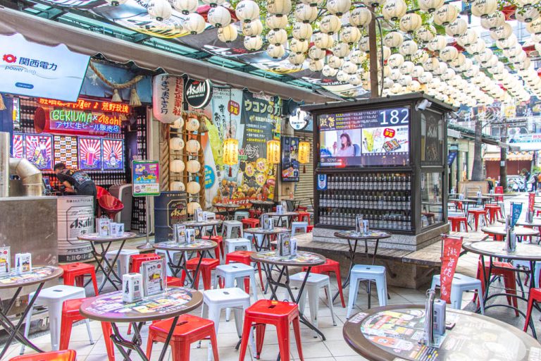 整體的環境看上去很有日本商店街的感覺,抬頭便看見滿滿的燈籠,晚上還會隨著音樂變動明亮。