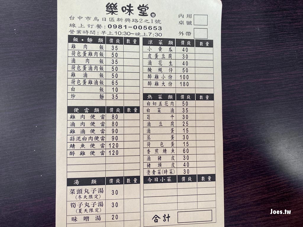 樂味堂雞肉飯位於台中烏日區的新興路上,google查詢距烏日吊橋及星巴克 (烏日中山門市)約莫3-400公尺處,樂味堂的外觀溫和質樸簡單無過多裝飾僅有幾顆彩球來提醒過路人這裡有家新店家開幕了 ,門口上方懸掛的平面式招牌散發著懷舊氣息並且用了幾個簡潔醒目的字告知過路客店內有雞肉飯/滷肉飯/各式小菜外,一旁還寫上『一碗飯的厚道,一口味的傳承』讓我感覺有點要告知路過的人,這餐廳想讓客人吃到的每碗飯裡都能吃得到店家的用心與實在,感受每一口都保留著傳統的滋味,說真的剛路過時只看外觀我還以為是佛具店?!細看上面的字才發現是間餐館。