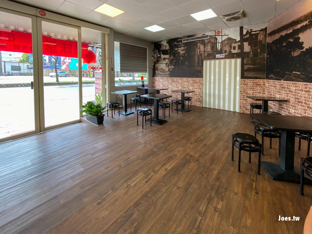 裝潢整潔俐落選用木質色地板搭著牆上的復古街景營造懷舊風格,店內寬敞明亮,看上去有6-8套桌椅,還有提供廁所與冷氣,餐巾紙則是在牆面整體來說還蠻適合家庭或朋友共享。