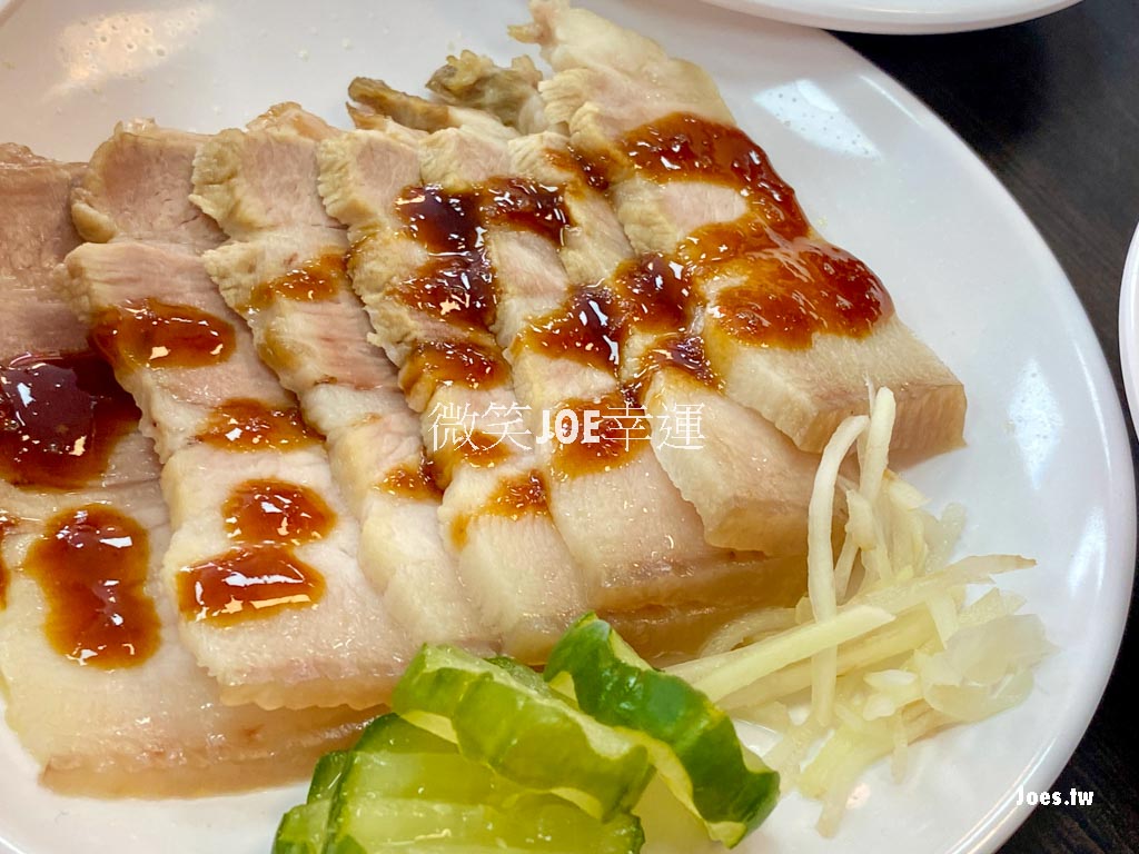 五花肉淋上油膏一旁還擺上薑絲與小黃瓜可以一同搭配著吃,瘦肉連著油脂處吃得到軟嫩,肥的部份連結著彈牙的皮,不論單吃或與配料一起都不賴。