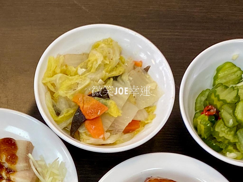 燙空心菜/荷包蛋雞肉飯/荷包蛋滷肉飯/白切五花肉/味增湯/雞肉飯/筍子丸子湯/白菜滷/滷豆腐/滷花生/蒸蛋/燙大陸妹*2/和風過貓/涼拌辣川耳(微辣)/小黃瓜