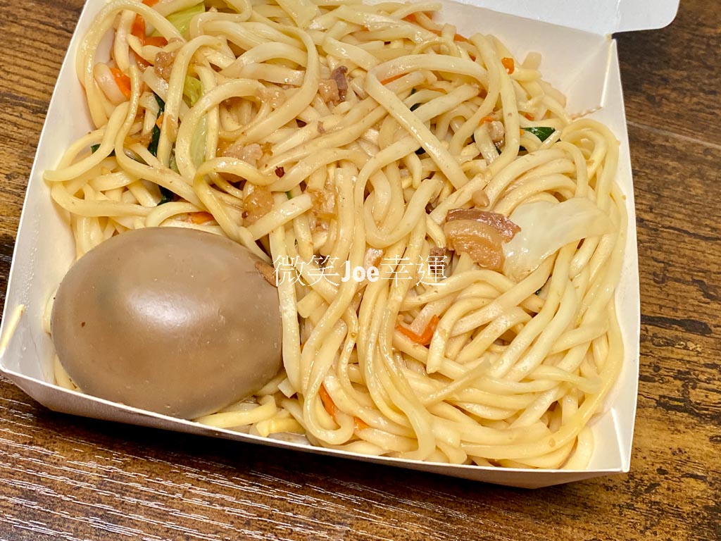 午餐回家後才想起最想知道的炒麵沒點到,於是晚餐去外帶了一份炒麵加滷蛋,看起來是用厚片盒大小的盒子裝,麵體有點像陽春麵的寬麵版,淋著肉燥有著少許配料,麵吃起來微鹹混合著油香入口滑順口感略帶Q勁,外帶的滷蛋很入味口感比較緊實整個厚片盒子麵是裝滿的。