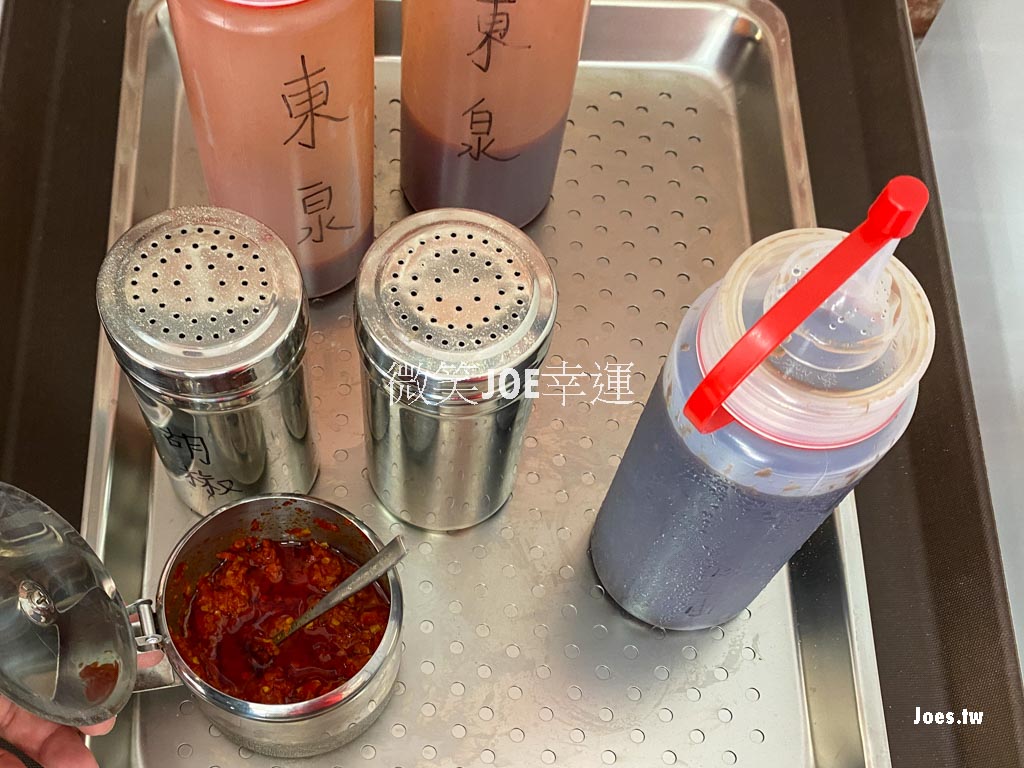 佐料有胡椒、辣椒醬、醬油膏還看見了炒麵標配台中人的血液-東泉辣椒。