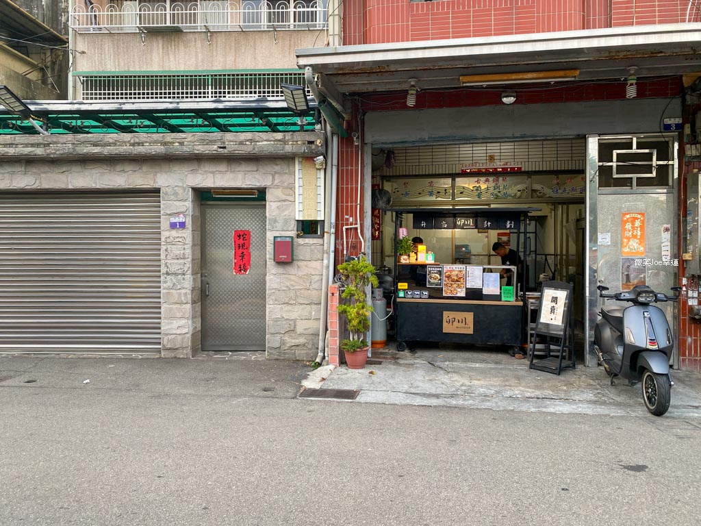 附近為住宅區,店面的外觀簡潔,內縮的攤位有標示卯川 字樣,門口也會擺放開賣小招牌。