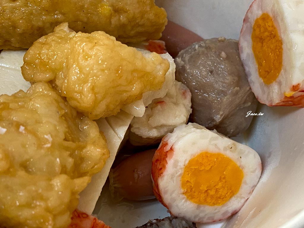 店家內用也是使用免洗餐具,而這價格真的會讓人敢把所有的品項都點一輪,鍋燒意麵麵體偏粗、口感扎實,裡面有小貢丸、鑫鑫腸、魚卵卷、豬肉片和魚板。我加了一顆蛋,當正餐吃也可以加麵,份量更足。