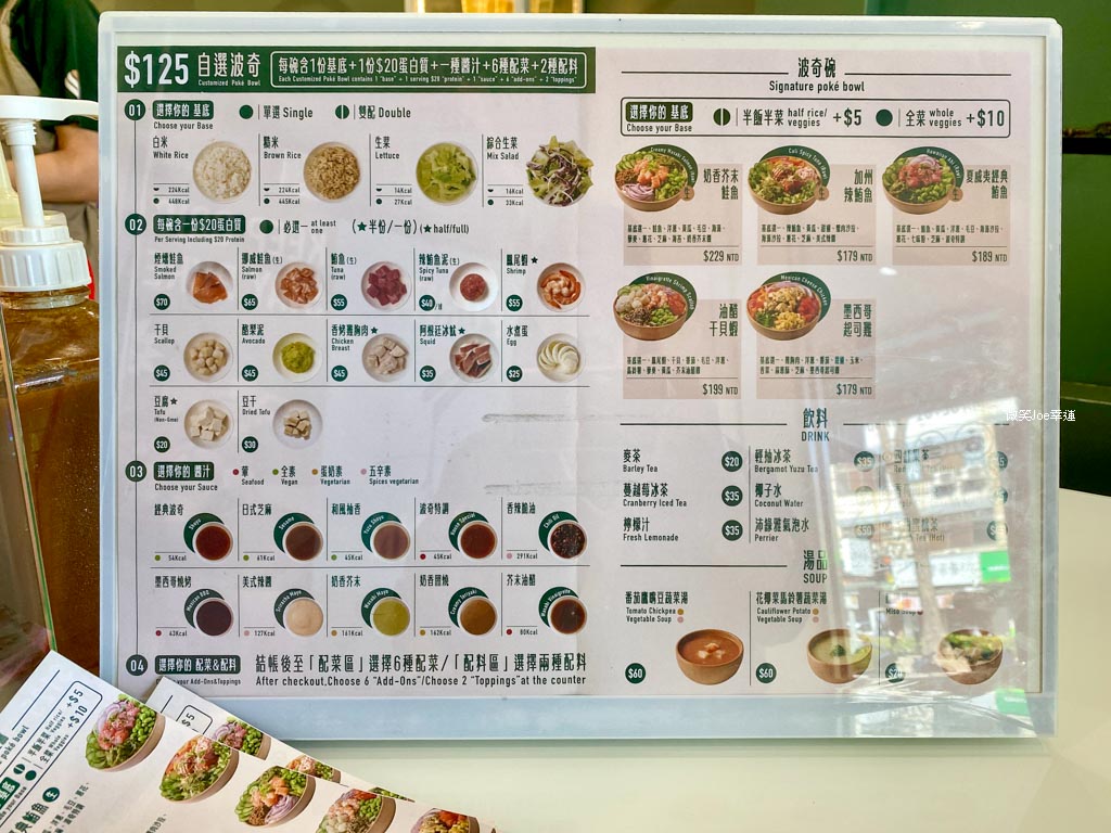 從店名就直接告訴你他們主打的是夏威夷風格的波奇碗(Poke Bowl),算是現在很流行的健康餐盒類型,把生的或熟的蛋白質放在飯或沙拉底上,再配上自己喜歡的配料和醬料組合,能自己搭,懶得選的話店家本來就有配好的推薦組合可直接點,變化很多彈性大。