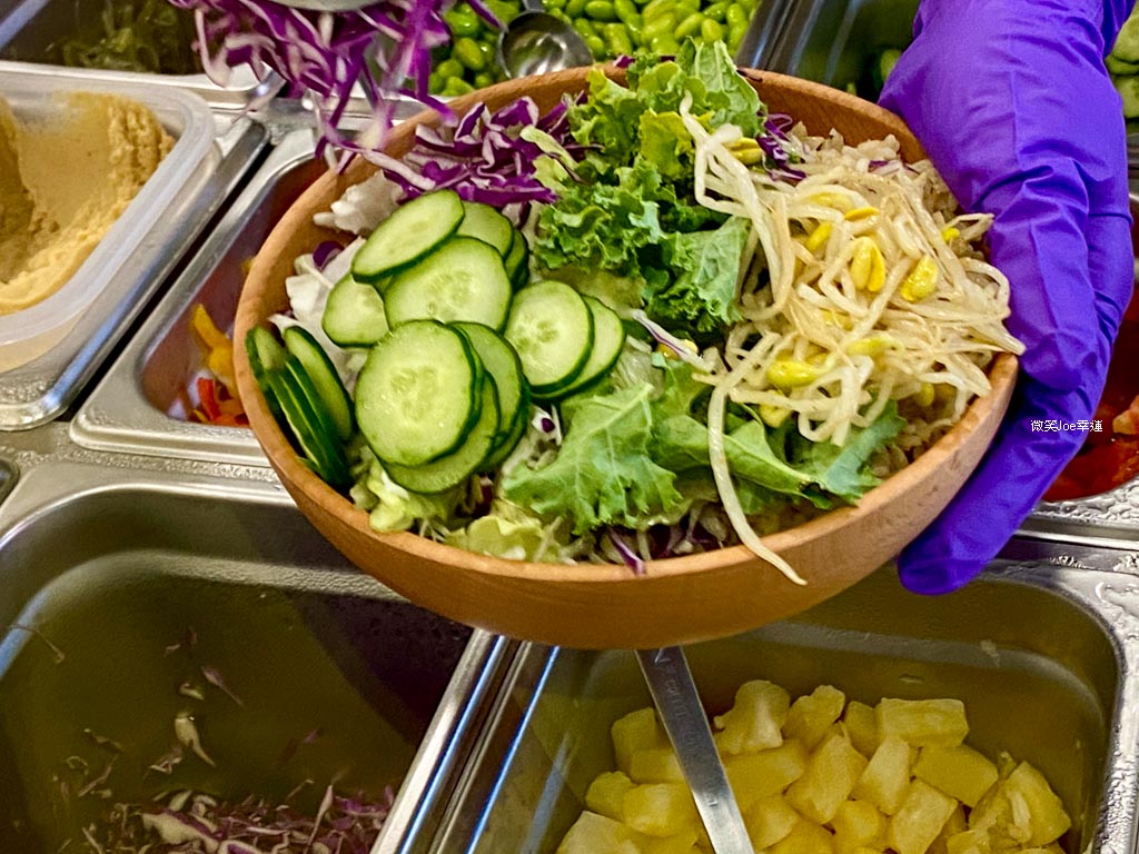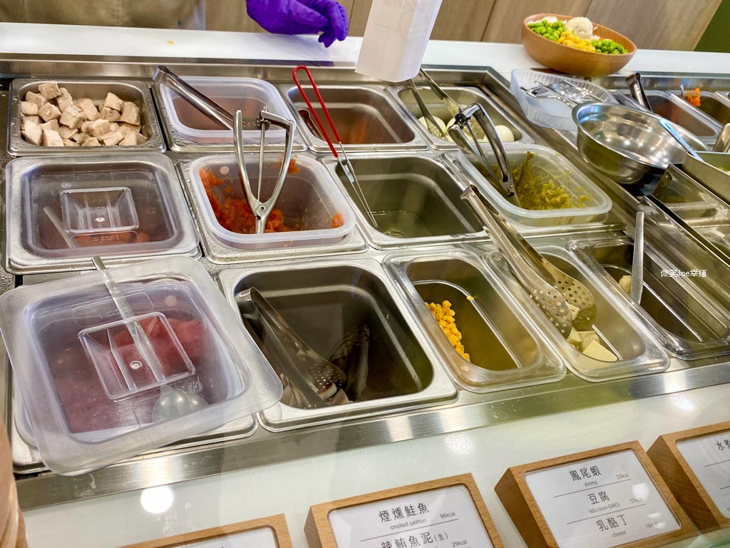 配料全都擺放在保鮮櫃內,此次檯面中看到他們的綜合生菜裏是有高麗菜絲、萵苣、紫高麗菜的混合基底,飯的話是糙米。