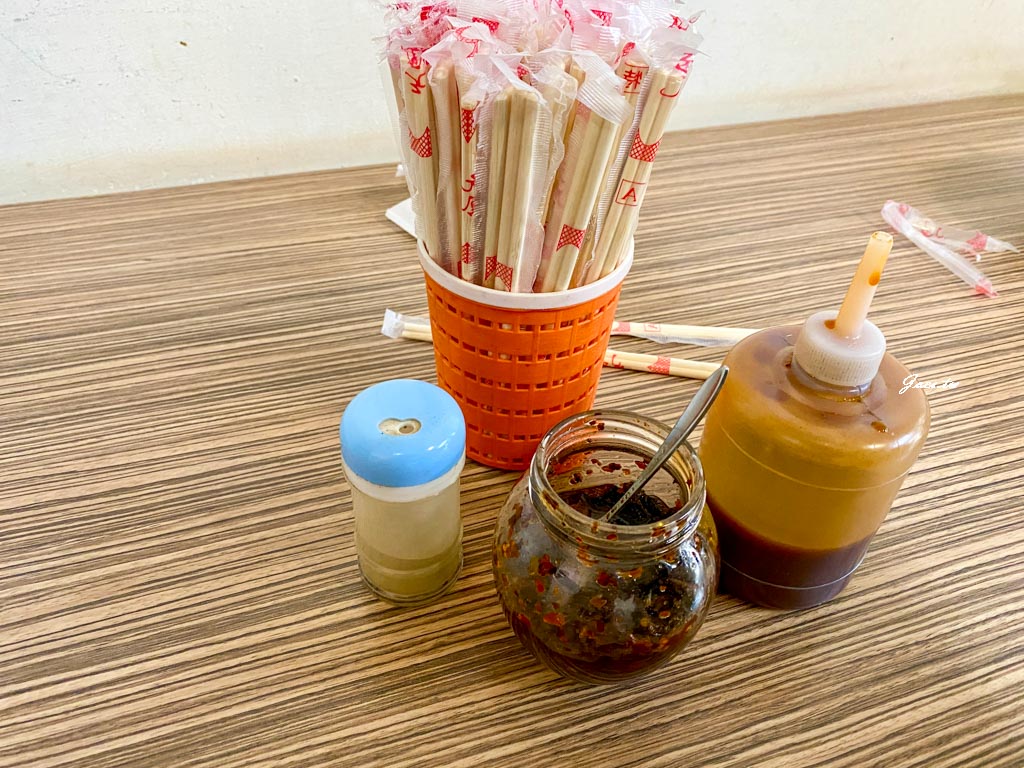 桌面上有著免洗筷與幾款調味料(白胡椒、豆豉辣椒醬、甜辣醬)。
