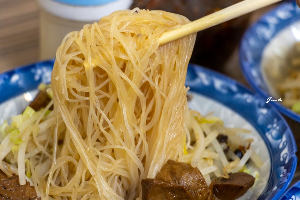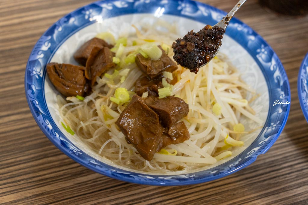 麵與米粉上都有放了豆制品/芹菜/豆芽菜/素燥,素燥裡有少量微脆感的小丁讓咀嚼時不單單只有豆芽的清脆。