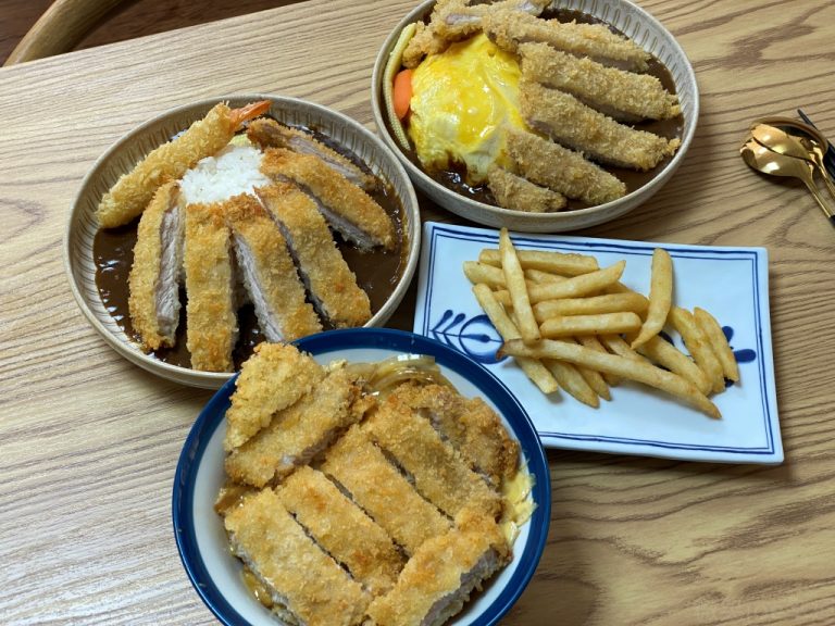 今天點了豪華海陸咖哩飯、歐姆蛋厚切炸豬排咖哩飯、爽脆厚切炸豬排壽喜丼飯跟單點一份薯條。