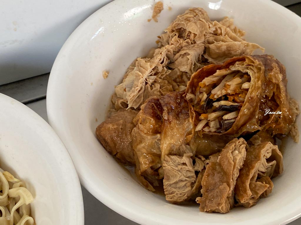 豆雞/菜捲/豆皮/素雞,店家是直接把小菜全放一起,其中對菜捲印象較深,有筍絲/木耳/紅蘿蔔,外皮韌性比較足,整口吃起來很有口感。內餡感覺有先炒過。