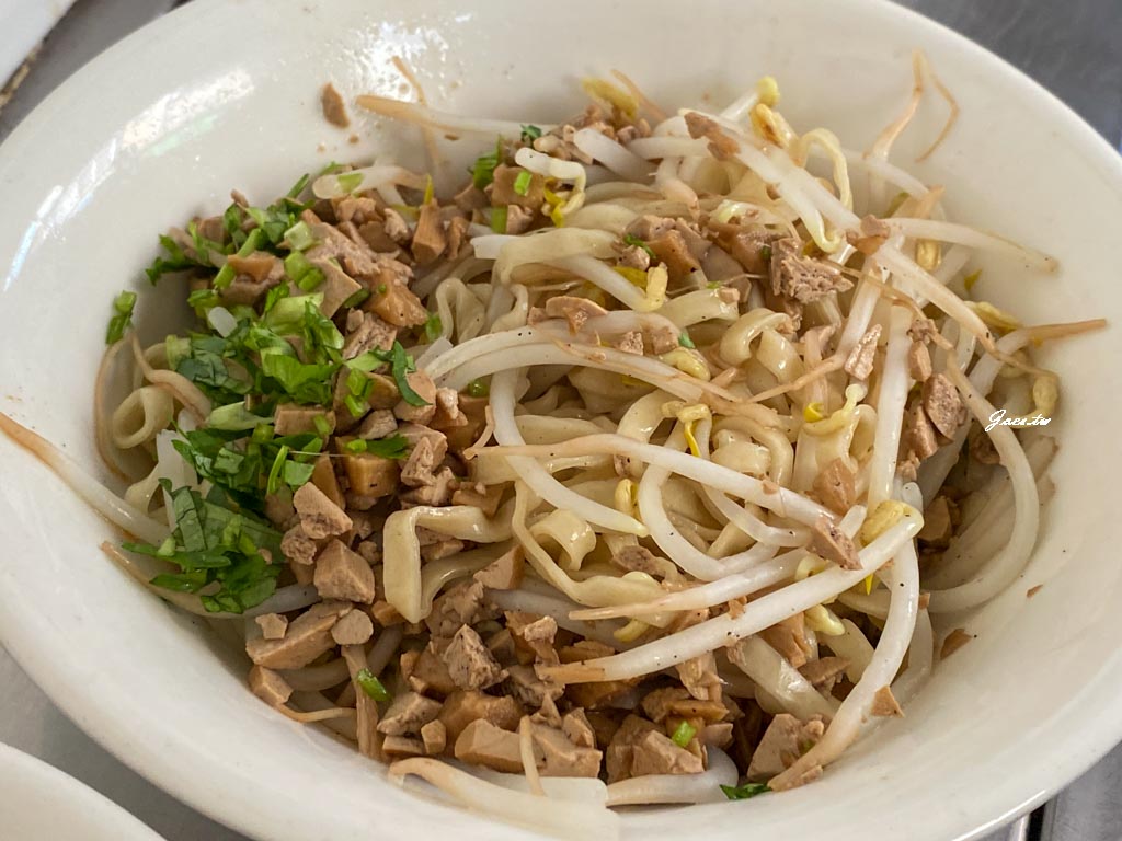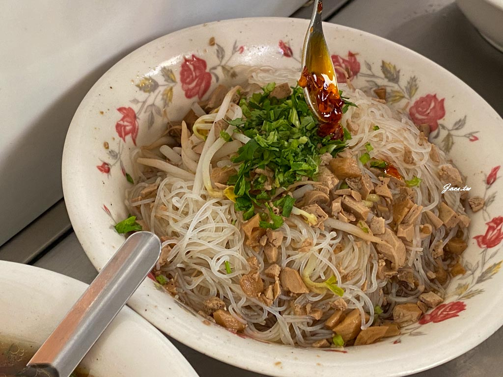 米粉上頭撒了些許香菜、豆芽菜與豆乾丁麵腸丁的素燥,店內有辣椒胡椒與辣醬可以加,低部有少許和麵腸湯相似的湯汁,麵體吃來帶些細微的回彈感。