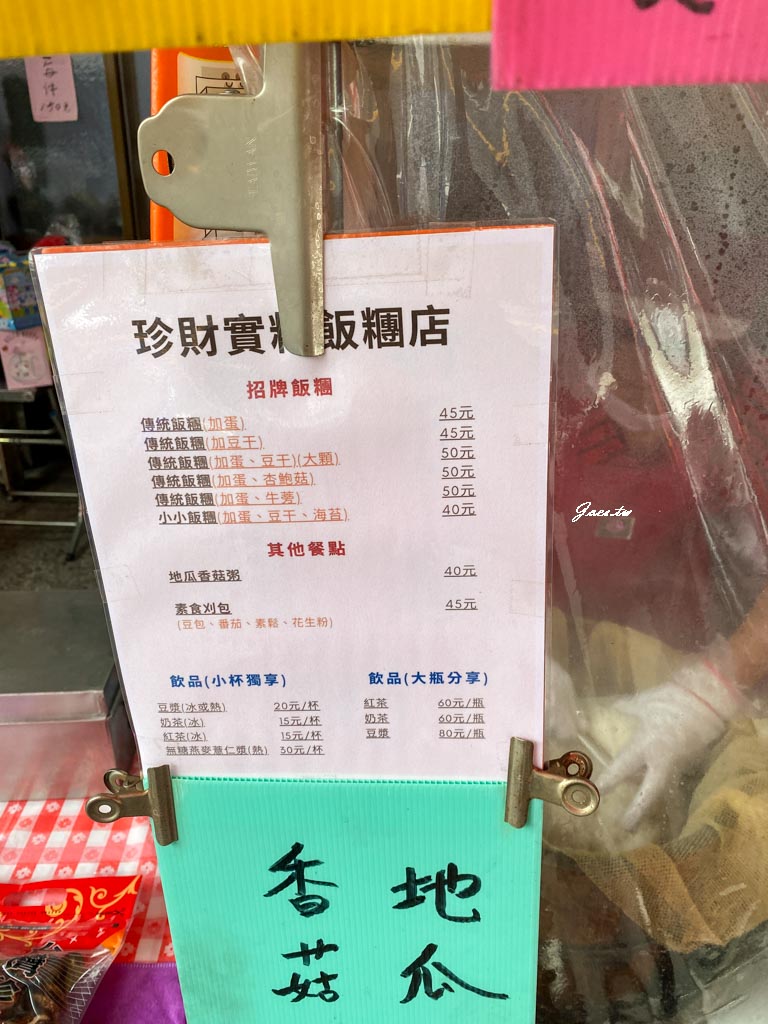 珍財實料飯糰主打的是招牌飯糰,口味組合略有變化,除了飯糰,也有熱呼呼的素粥、刈包與各種飲料可以點,不過要記得店家僅提供外帶。