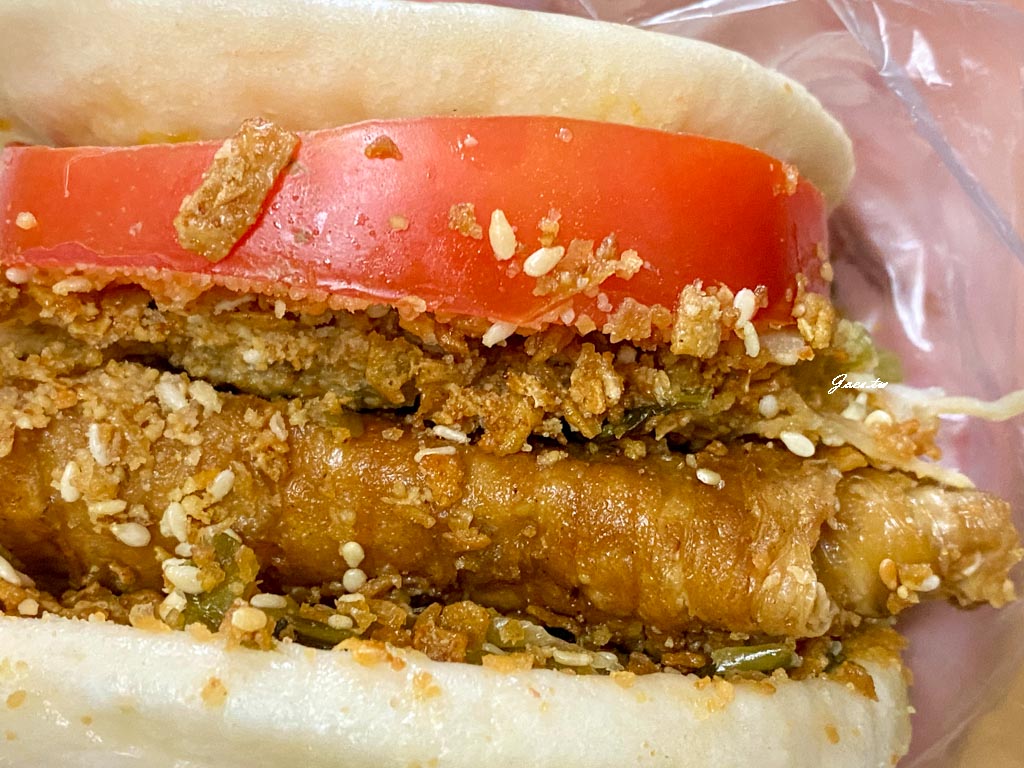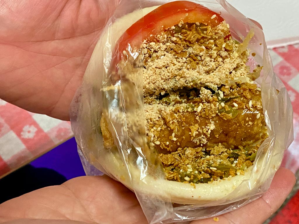 刈包裡有甜味花生粉/素鬆/酸菜/豆包/蕃茄/牛蒡絲。