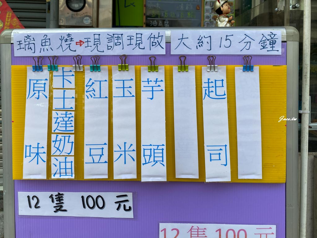 璃魚燒的口味有五種,十二隻100元,當天店家詢問是要買12隻或買6隻50元,聊天得知璃魚燒是近期才開始的,而內餡裡的紅豆和芋頭是店家自製,口味未來可能會再調整。